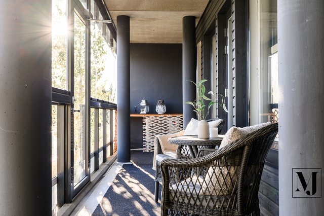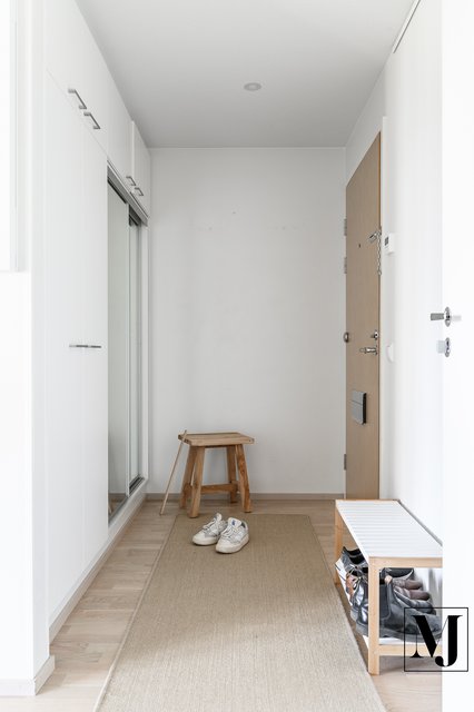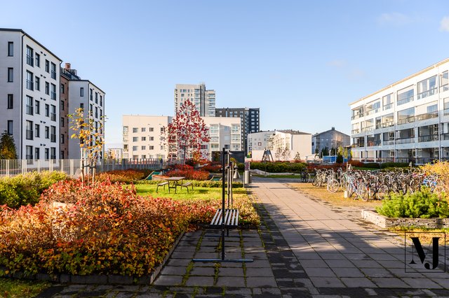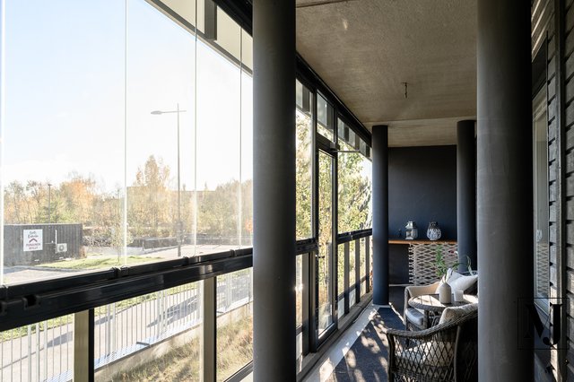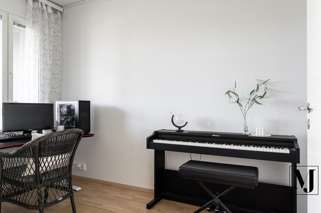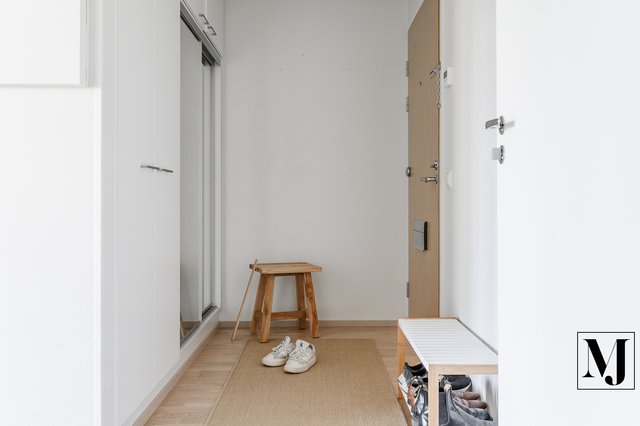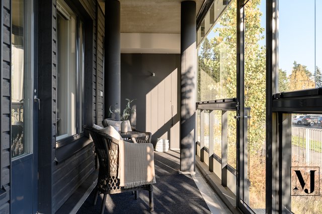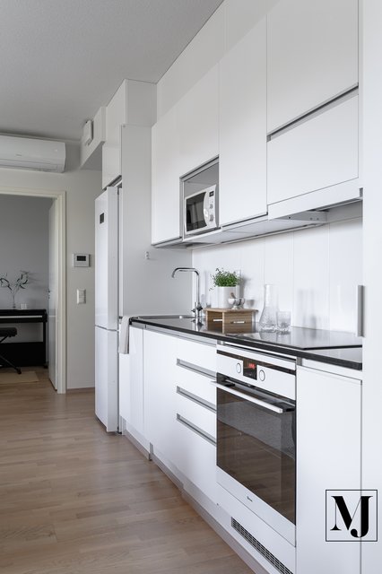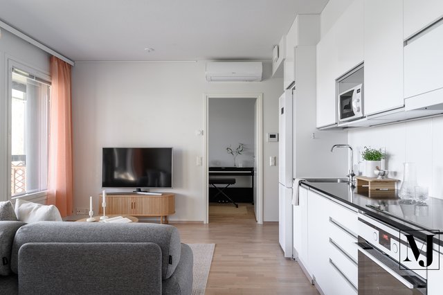 Keittiö olohuone muodostavat yhtenäisen avaran tilan ja kodin kaksi makuuhuoneista avautuvat puiston puolelle. Keittiö on ajattoman tyylikäs. Korkeakiiltoiset kaapistot, kivitaso ja integroidut kodinkoneet luovat ajattoman ja tyylikkään kokonaisuuden. Olohuoneesta on kulku lasitetulle parvekkeelle, joka toimii kuin yhtenä lisähuoneena aikaisesta keväästä pitkälle syksyyn. Parveke on koko huoneiston levyinen ja ilmalämpöpumppu pitää huoneiston kesällä vilpoisena.