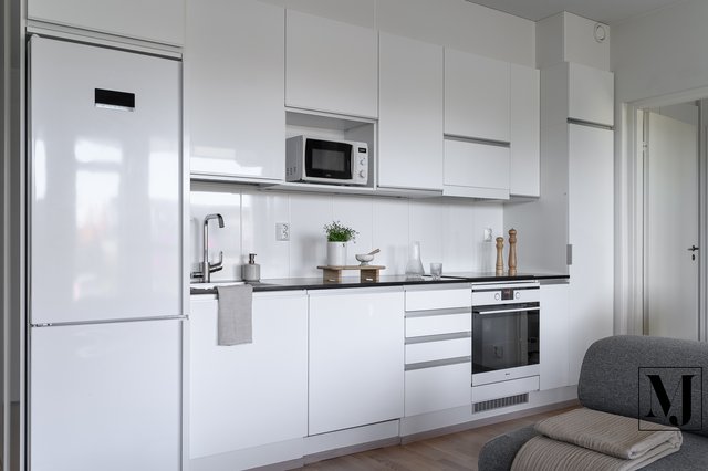 - Vaaleat kaapistot, kivitaso, jääkaappi-pakastin, induktioliesi, erillisuuni sekä integroitu astianpesukone.