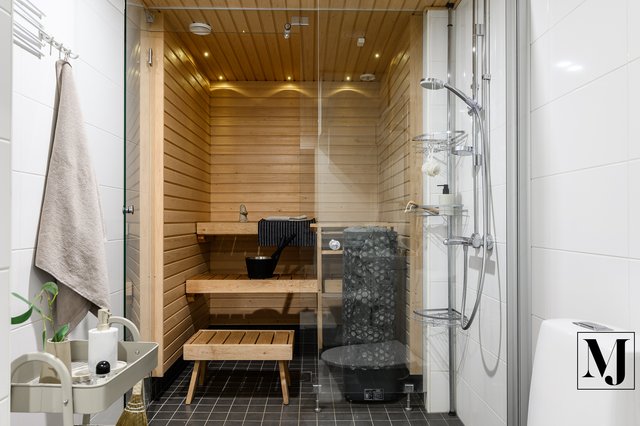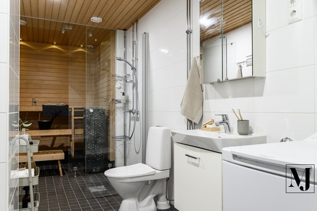 - Tilava kylpyhuone, jossa wc-istuin, suihku, suihkuseinä, pesuallas, allaskaapisto, peilikaappi ja pyykinpesukoneliitäntä. Lattiassa on laatat ja seinät kaakeloitu.