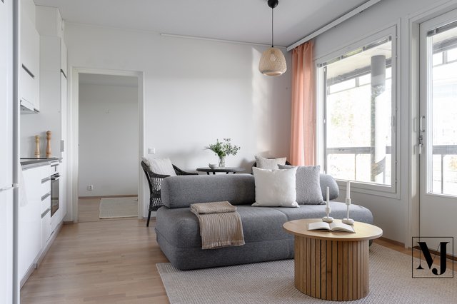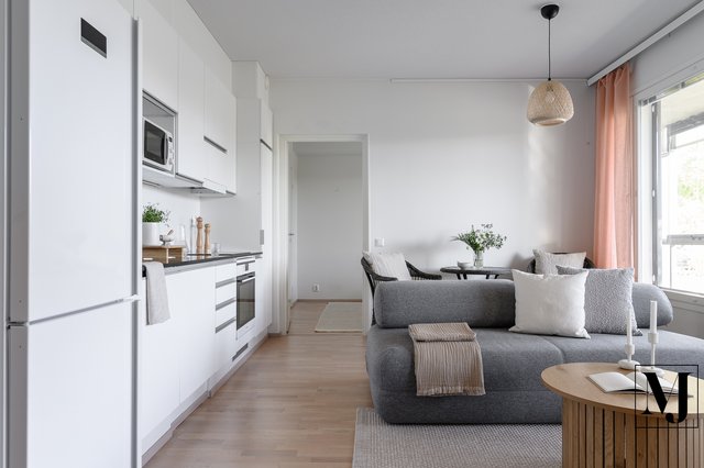 - Valoisa olohuone ja keittiö muodostavat yhtenäisen ja avaran tilan. Olohuoneesta on käynti lasitetulle parvekkeelle.