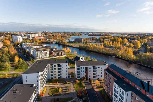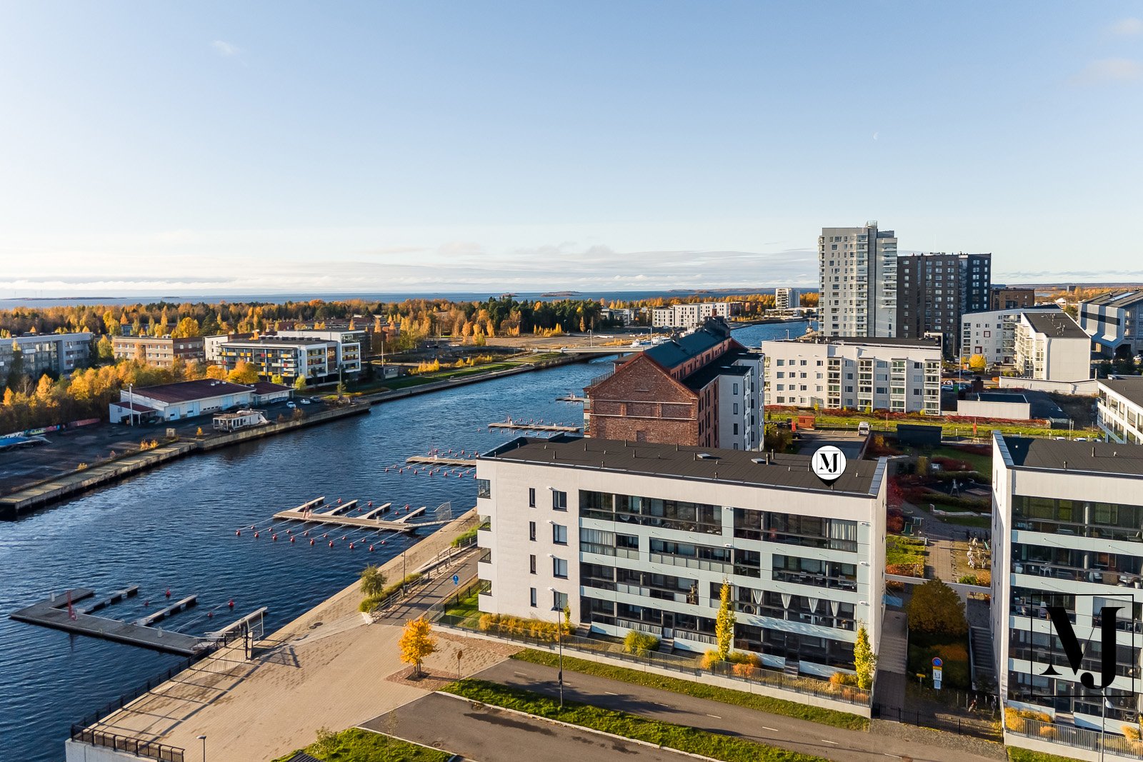 Ensimmäisen kerroksen valoisa huoneisto. Tästä kodista avautuu avarat näkymät suoraan Toppilansalmen kanavan ja puiston suuntaan. Keittiöstä, olohuoneesta ja lasitetulta parvekkeelta voit ihailla Salmen vesistöä sekä idyllistä punaista aittaa rannassa, joka muistuttaa satamamiljöön historiasta.