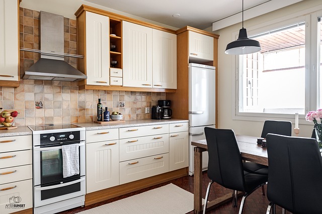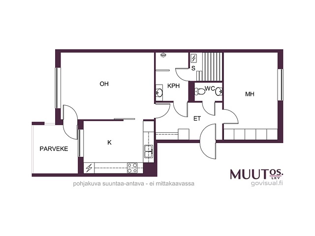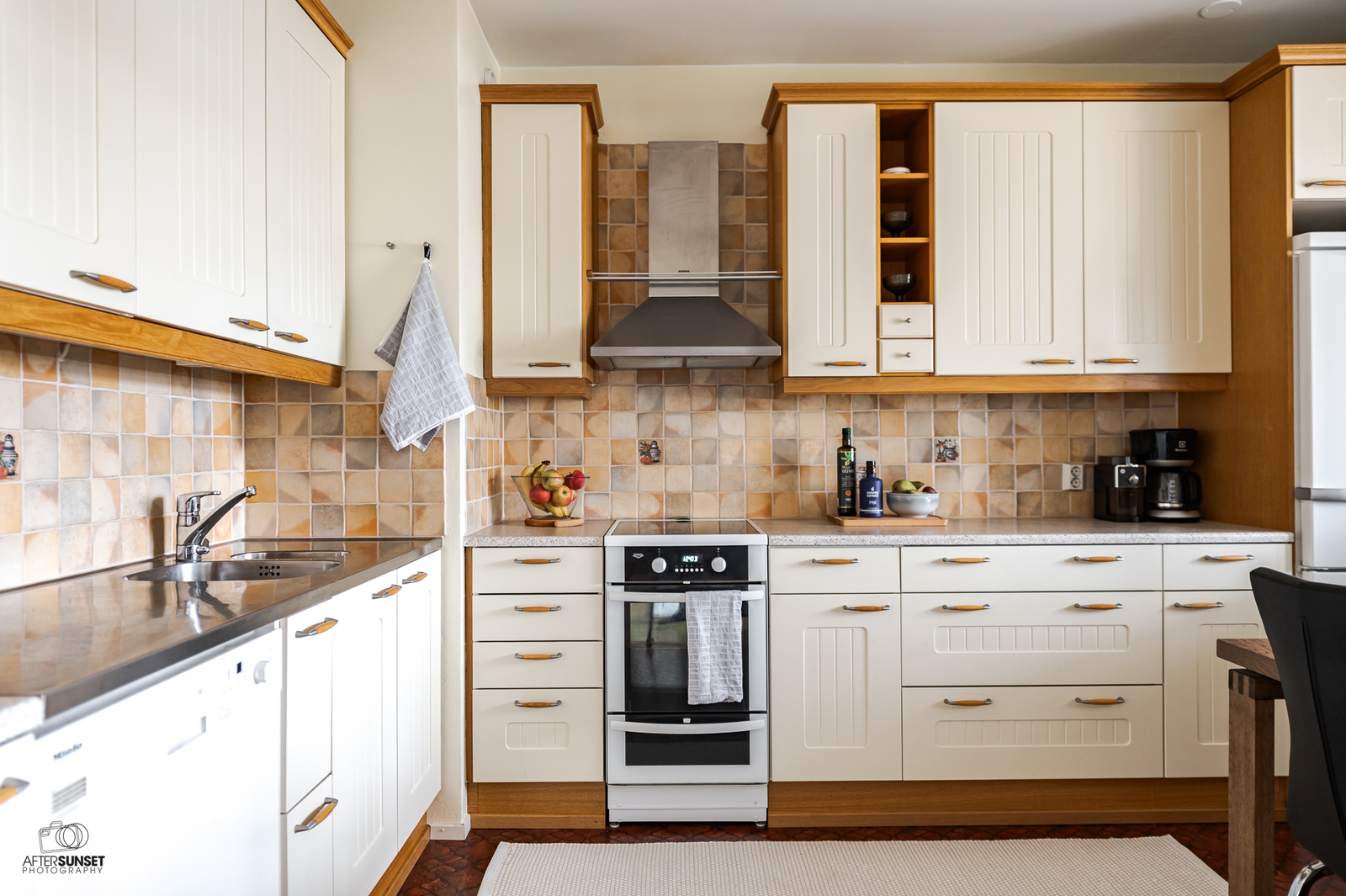 - Varustus: Jääkaappipakastin, lattialiesi induktiotasolla, liesituuletin, astianpesukone, kiinteät kaapistot ja kiinteät valaisimet. Materiaalit: Lattiapinnat muovimatto, työtasot laminaattia ja seinäpinnat maalattu ja välitila laatoitettu.