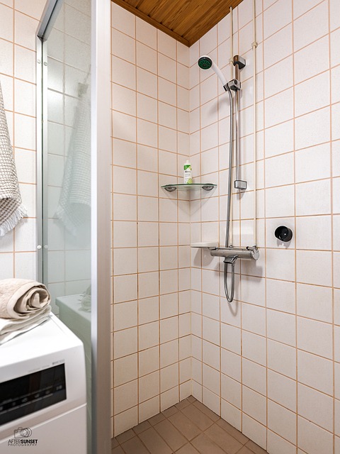 - Varustus: Suihku, allaskaappi, peili, kiinteä kaappi, pesukoneliitäntä ja kiinteät valaisimet. Materiaalit: Lattia- ja seinäpinnat laatoitettu.
