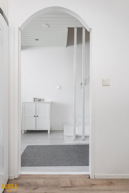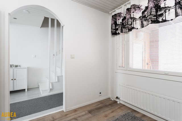 - Valoisa olohuone josta kulku takapihalle. Lattiat laminatti, seinät maali, katto mdf.