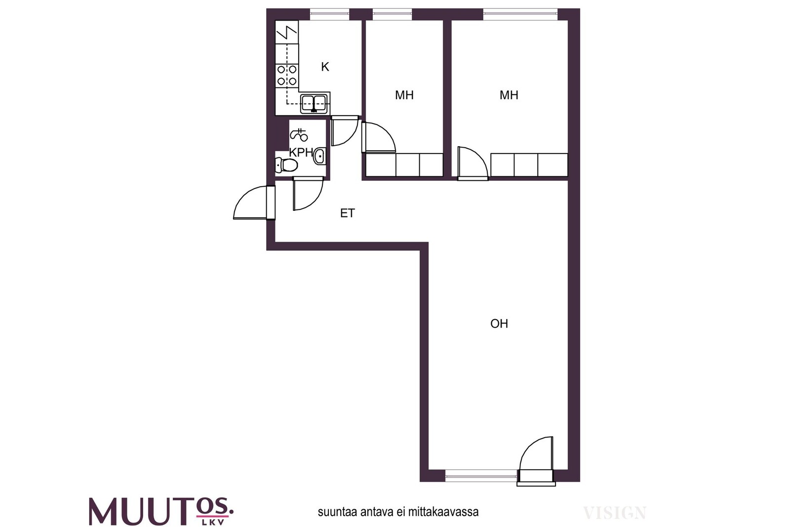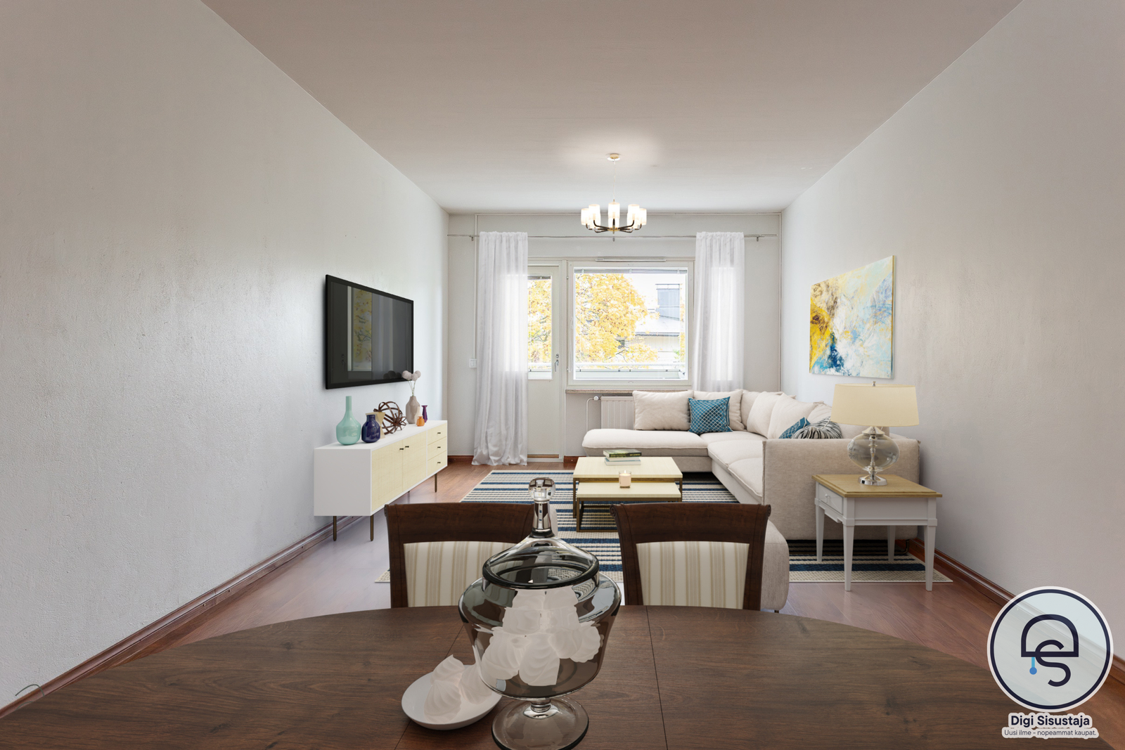 Huoneisto on siistissä kunnossa ja tässä on mahdollisuuksia moneksi. Olohuone asunnossa on valtavan iso ja siihen saakin halutessaan aseteltua sohvaryhmän lisäksi esimerkiksi ison ruokapöydän tai miksei vaikka parisängyn niin halutessaan. Keittiössä on liitännät valmiina pyykkikoneelle, jos sen haluaa sinne laittaa. Toki vaihtoehtona on käyttää yhtiön pesutupaa. Mukavan kokoinen lasitettu parveke on rauhallisen sisäpihan puolelle ja vaikka ympäristössä liikkuu autoja, pahimmat ruuhkat ja metelit ovat kauempana tästä yhtiöstä.
