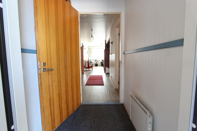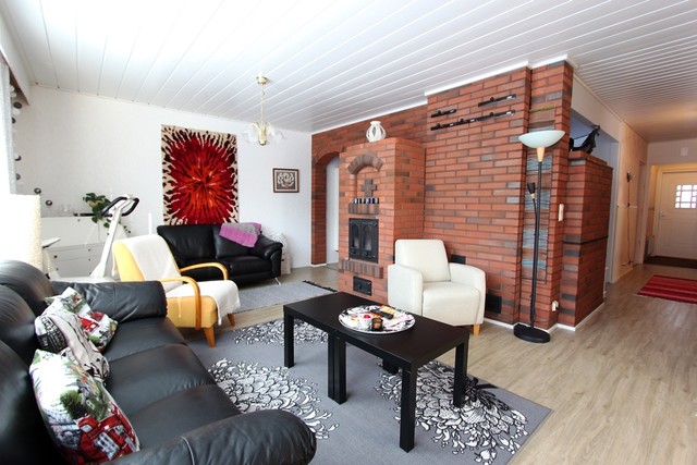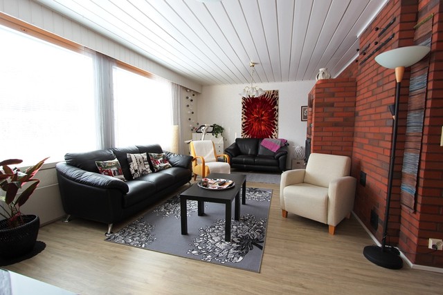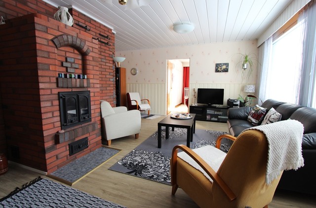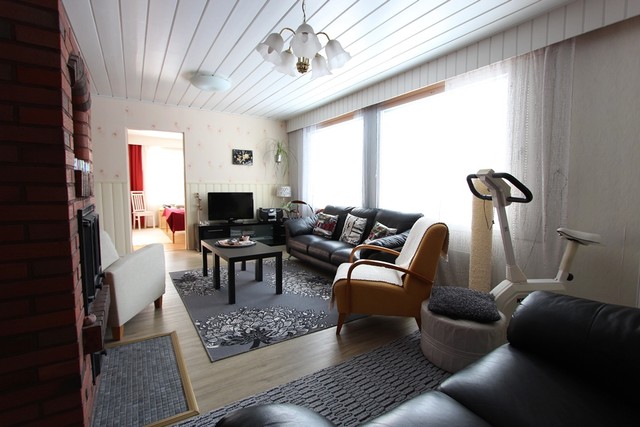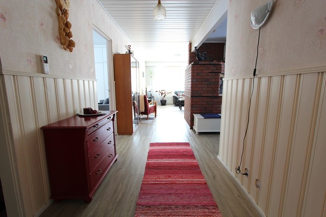 - Makuuhuoneet halteksia. Keittiö, olohuone, käytävä, kylpyhuone ja sauna puupanelia.