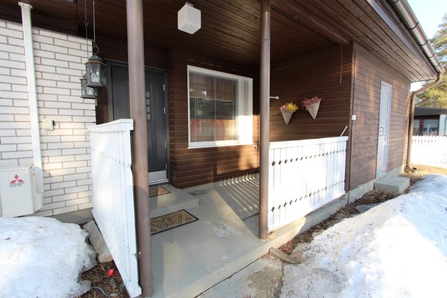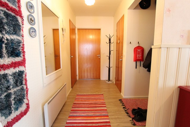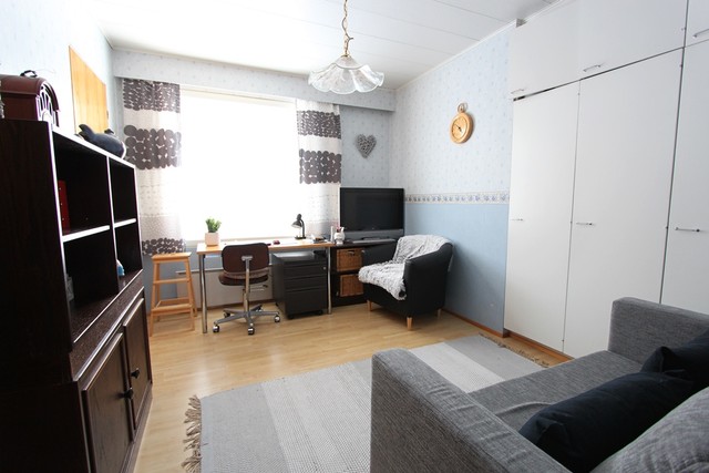 - Keittiö, olohuone ja käytävä vinyylilattia. Makuuhuoneet laminaattia. Kylpyhuone, wc ja sauna laattaa.