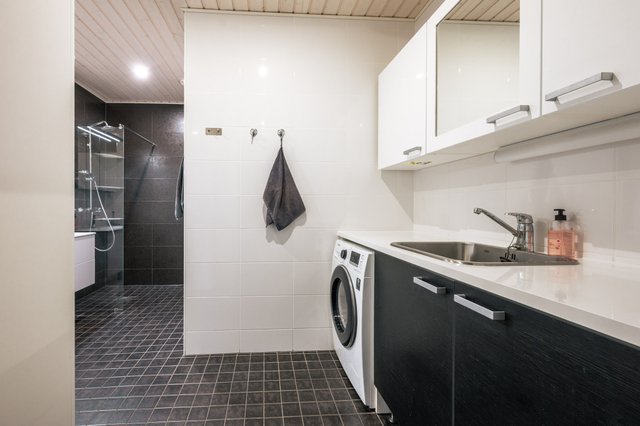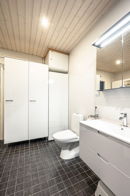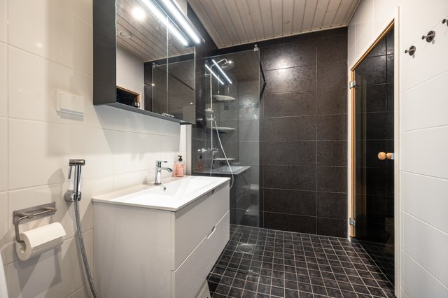 - Lattialämmitys, allaskaappi, peilikaappi, pesukoneliitäntä, suihkuseinä, bidee-suihku, wc-istuin, suihku, ja pesuallas