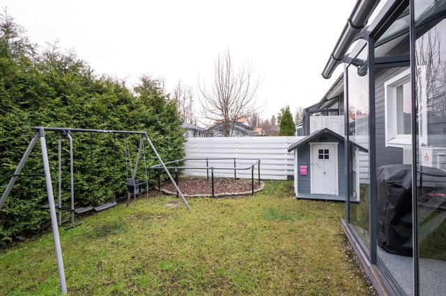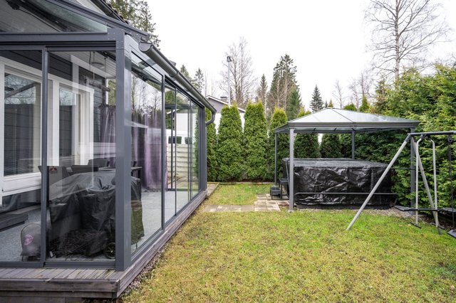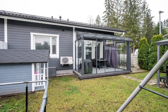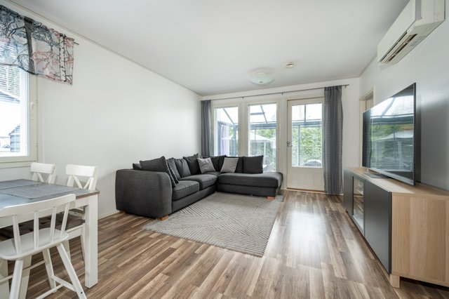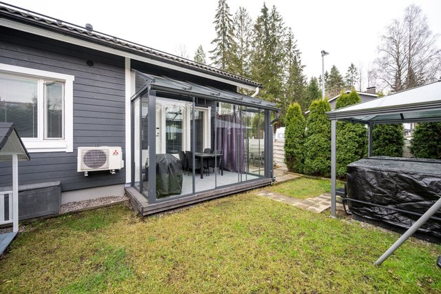 Kolmen huoneen ja keittiön kokonaisuus on suunniteltu toimivaksi. Keittiö, ruokailutila ja olohuone muodostavat avaran ja valoisan kokonaisuuden. Olohuoneesta avautuu lasitettu terassi, joka tuo lisätilaa ja mahdollistaa ulkoilmasta nauttimisen pitkälle syksyyn. Sauna ja kylpyhuone tarjoavat rentoutumishetkiä arjen keskellä. Suojaisalla piha-alueella on ulkoporeamme, jota voit käyttää ympäri vuoden. Perheen pienemmille on leikkimökki.