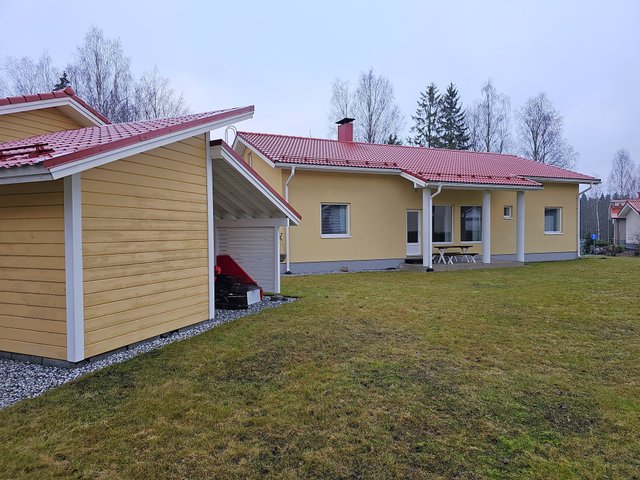 Autotalli, pihavarasto, talon räystäs- ja otsalaudat huoltomaalattu v.2022.