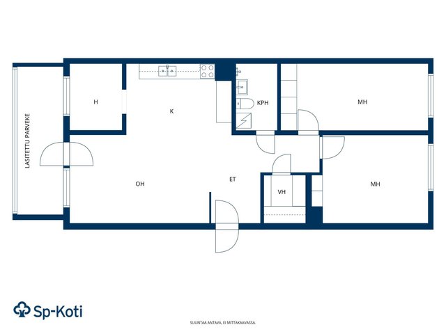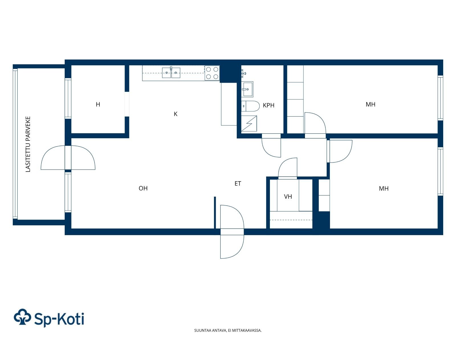 - läpitalon koillinen-lounas. Lasitettu parveke lounaaseen piha- ja pientalonäkymin