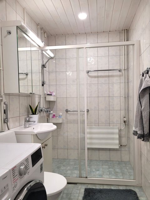 - WC-istuin, suihku, suihkuseinä, pesukoneliitäntä, peilikaappi, pesuallas, ja allaskaappi