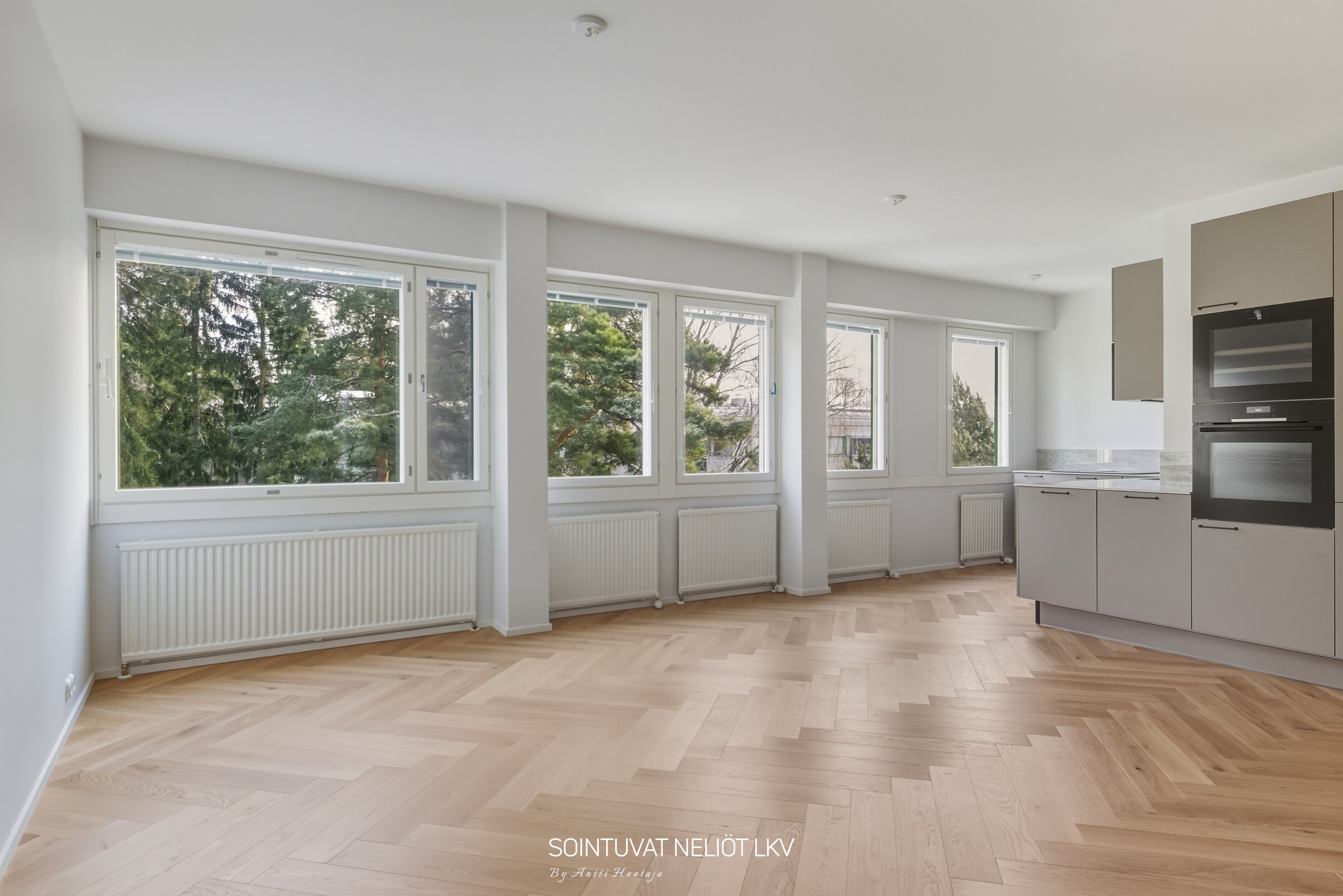 Tarjolla upeasti remontoitu läpitalon kolmio hissitalon ylimmässä kerroksessa. Tämä laatua ja tyyliä huokuva asunto hurmaa esteettistä silmää hivelevillä materiaalivalinnoillaan sekä korkealta aukeavilla puistomaisilla ikkunanäkymillään.
