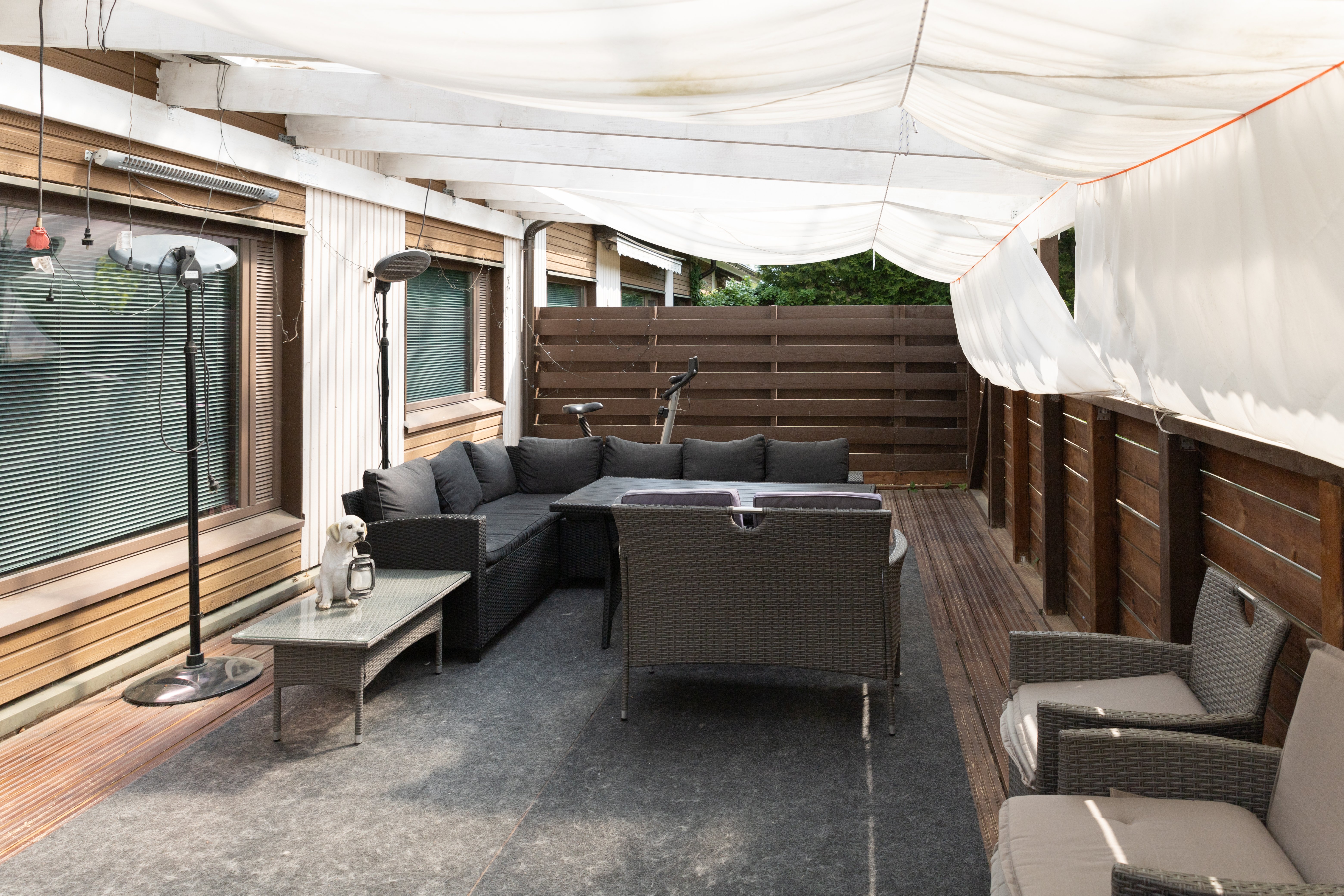 - Takapihalla koko asunnon levyinen katettu terassi.