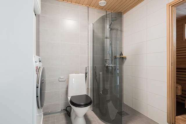 - Kokonaan laatoitettu. Suihku, wc, peili- ja allaskaapit, bidee-suihku. Pesukoneliitäntä.