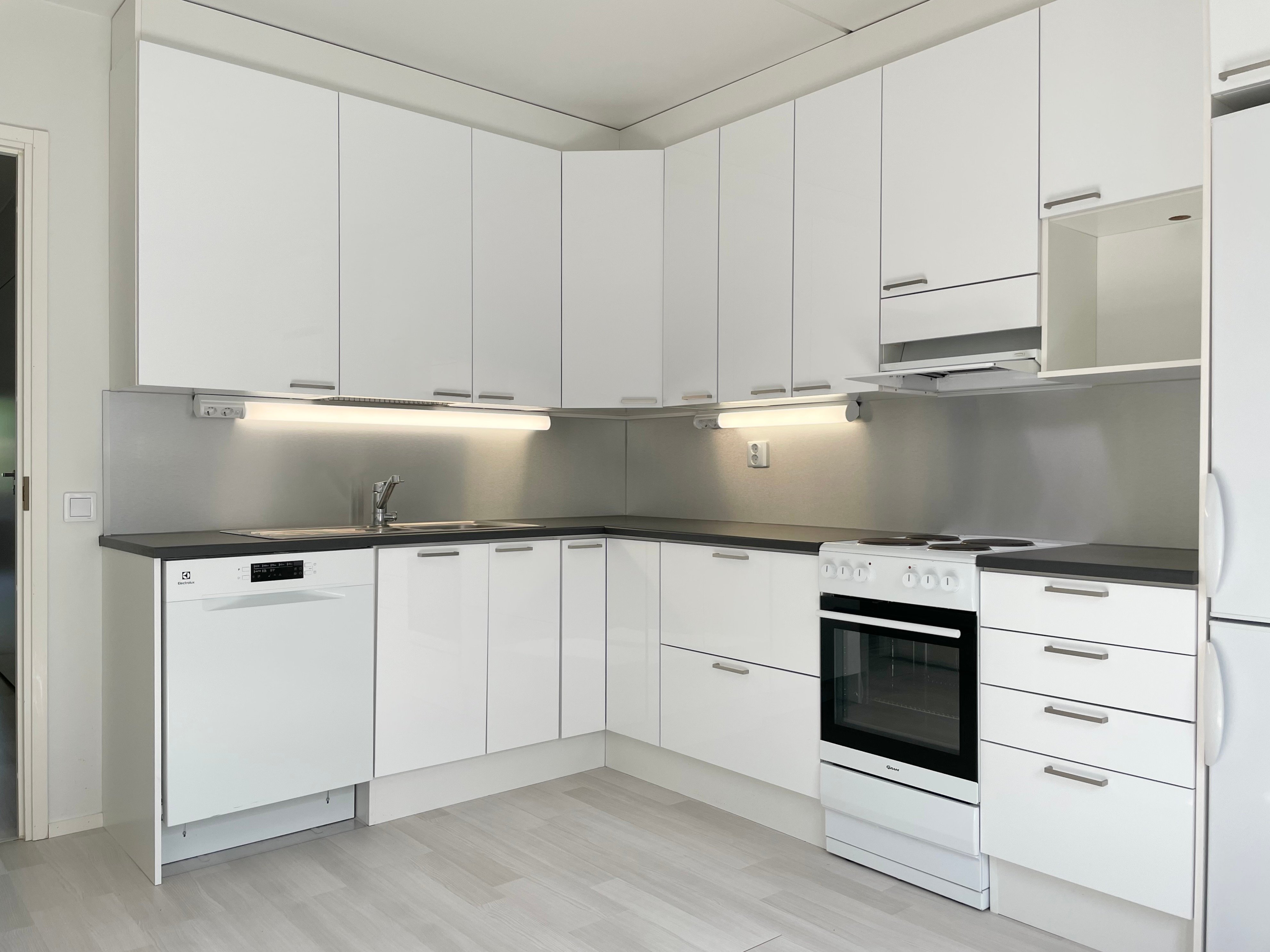 - Keittiö remontoitu 2020. Laminaattilattia, seinät maalattu. Valkoiset kaapin ovet, tumman harmaa laminaattitaso ja välitilassa levy. Jääkaappipakastin, sähköliesi, liesituuletin ja astianpesukone.
