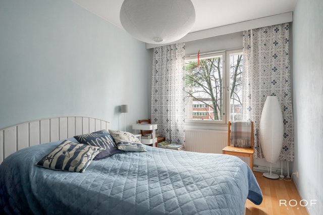 - Rauhallinen ja valoisa makuuhuone, joka on helposti kalustettavissa ja tarjoaa hyvät puitteet lepoon. Ikkuna tuo runsaasti luonnonvaloa ja avautuu viihtyisiin näkymiin.