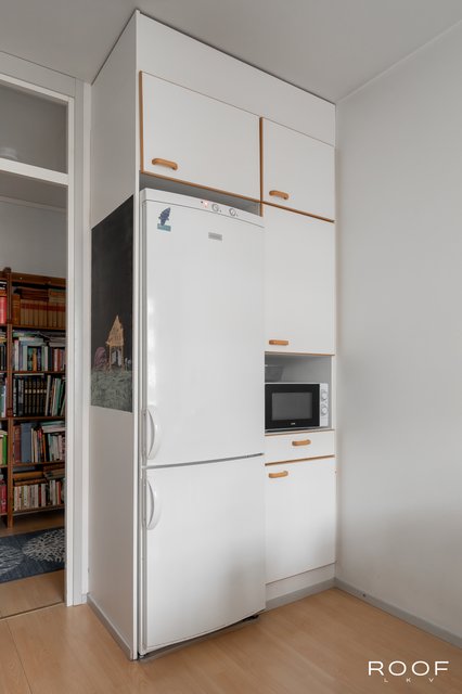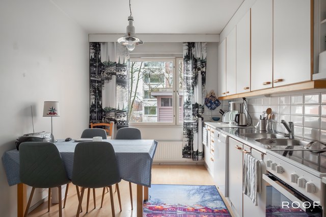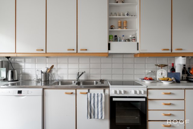 - Valoisa ja toimiva keittiö, jossa on runsaasti kaappi ja laskutilaa. Selkeä linjasto ja vaaleat kaapistot luovat ajattoman ilmeen. Keittiöön mahtuu hyvin ruokapöytä, ja ikkunan äärellä ruokailu on miellyttävää. Varusteluun kuuluu mm. liesi, uuni, astianpesukone, jääkaappi-pakastin sekä mikroaaltouuni. Keittiö tarjoaa käytännölliset puitteet arkeen ja ruoanlaittoon.