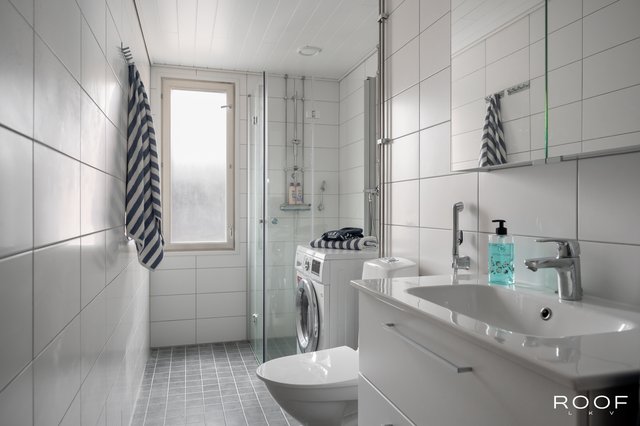 - Tyylikkäät ja hyvin hoidetut pesutilat, joissa on selkeä ja ajaton ilme. Tila on käytännöllisesti suunniteltu ja tarjoaa hyvin tilaa arjen käyttöön. Ikkuna tuo luonnonvaloa ja parantaa ilmanvaihtoa.