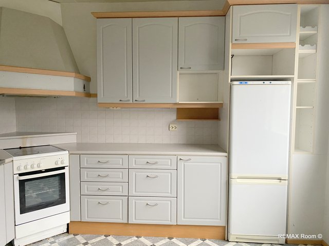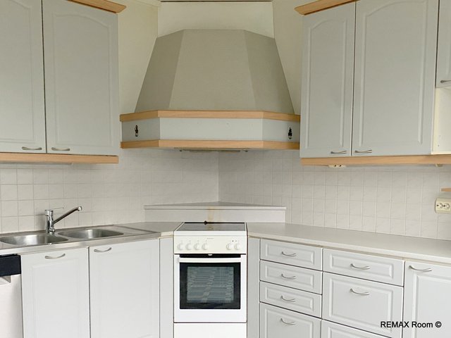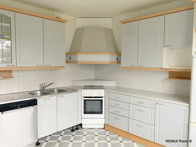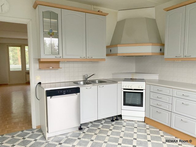 - Jääkaappi/pakastin, sähköliesi, liesituuletin, astianpesukone (2023). Seinät kaakeli (välitila) ja maali. Lattia muovimatto.