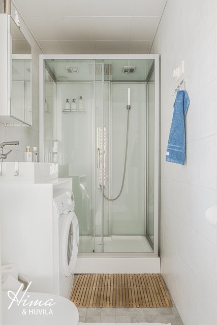 - Saunaosastolla tilava kylpyhuone, jossa suihku ja sähkötoiminen lattialämmitys. Makuuhuoneiden vieressä pienempi kylpyhuone, jonka varusteina suihkukaappi (2020), pyykinpesukone, allaskaapisto ja peilikaappi. Sähkötoiminen lattialämmitys. Hanat ja suihkut sekä allaskaapisto uusittu 2020.