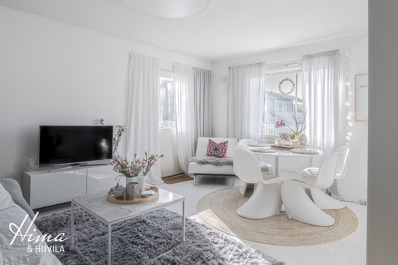 - Vaalea ja valoisa olohuone on tämän kodin sydän. Olohuoneesta on käynti suurelle taloa kiertävälle terassille.