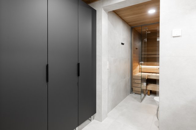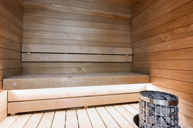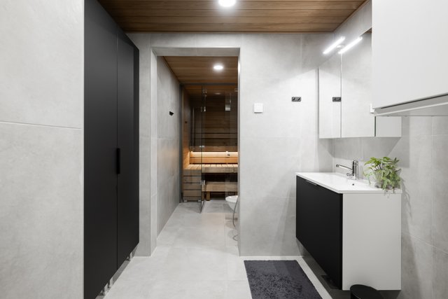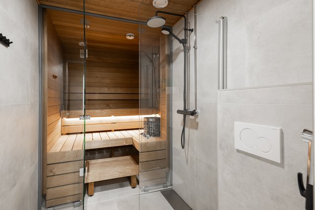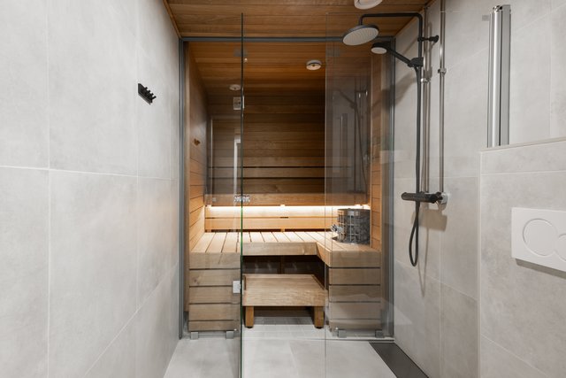 - Saunan varustuksena sähkökiuas. Lattiapinnat laattaa, seinäpinnat puuta.