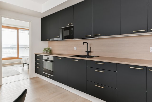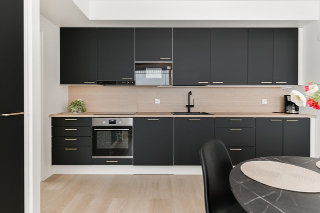 - Keittiön varustuksena integroidut jääkaappi, pakastin, mikroaaltouuni, astianpesukone, liesitaso, erillisuuni, kiinteät valasimet. Lattiapinnat kivikomposiiittivinyyliä, seinäpinnat maalattu.