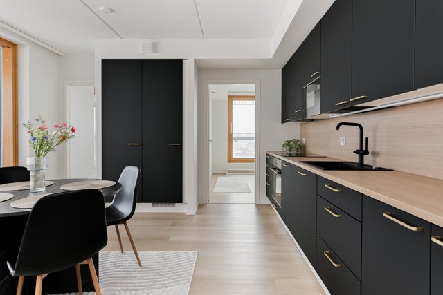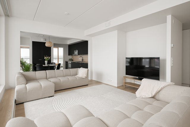 Avarassa keittiö- ja olohuonetilassa yhdistyvät tyylikkyys ja toimivuus. Keittiö on varustettu laadukkailla integroiduilla kodinkoneilla, runsaalla kaappi- ja laskutilalla sekä luonnollisella paikalla ruokailuryhmälle, josta on mukava ihailla ikkunoista avautuvaa maisemaa. Olohuone jatkaa samaa valoisaa linjaa ja tarjoaa tilaa oleskeluun ja yhdessäoloon. Kolme fiksusti sijoitettua makuuhuonetta, vaatehuone, kodinhoitohuone, sauna, erillinen wc sekä tyylikäs kylpyhuone tekevät arjesta vaivatonta ja viihtyisää. Huoneiston kaksi sivua kiertävä hulppea lasitettu parveke tuo lisäneliöitä asumiseen.