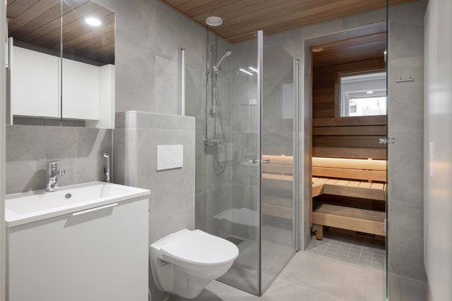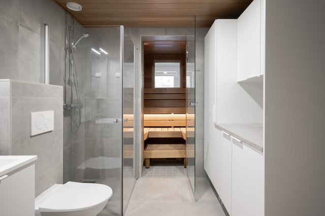- WC-istuin, pesukoneliitäntä, suihku, suihkuseinä, ja lattialämmitys