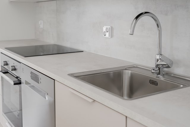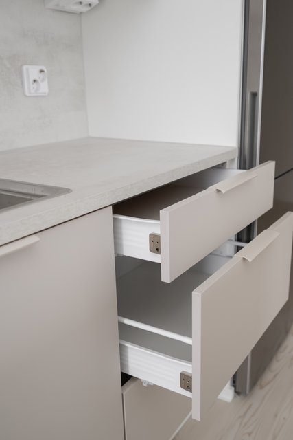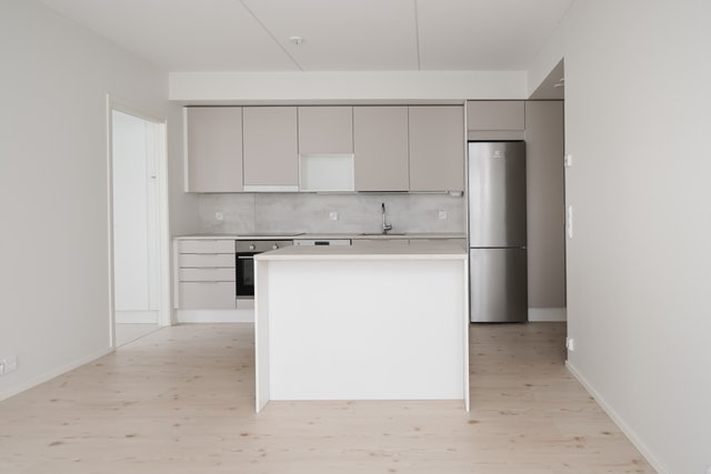 - Lattia valkolakattua kivikomposiittivinyyliä, koneet integroidaan kalusteisiin, kylmälaitteet ei integroituina.