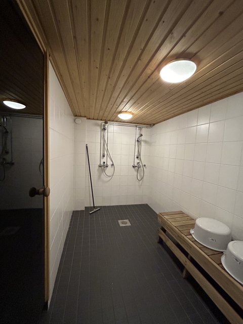 - Kylpyhuone on yläkerrassa. Uusittu putkiremontin yhteydessä. Lattia ja seinät laatoitetut. Suihku. Wc-istuin. Lavuaari ja peilikaappi. Pesukoneliitäntä. Lattialämmitys.