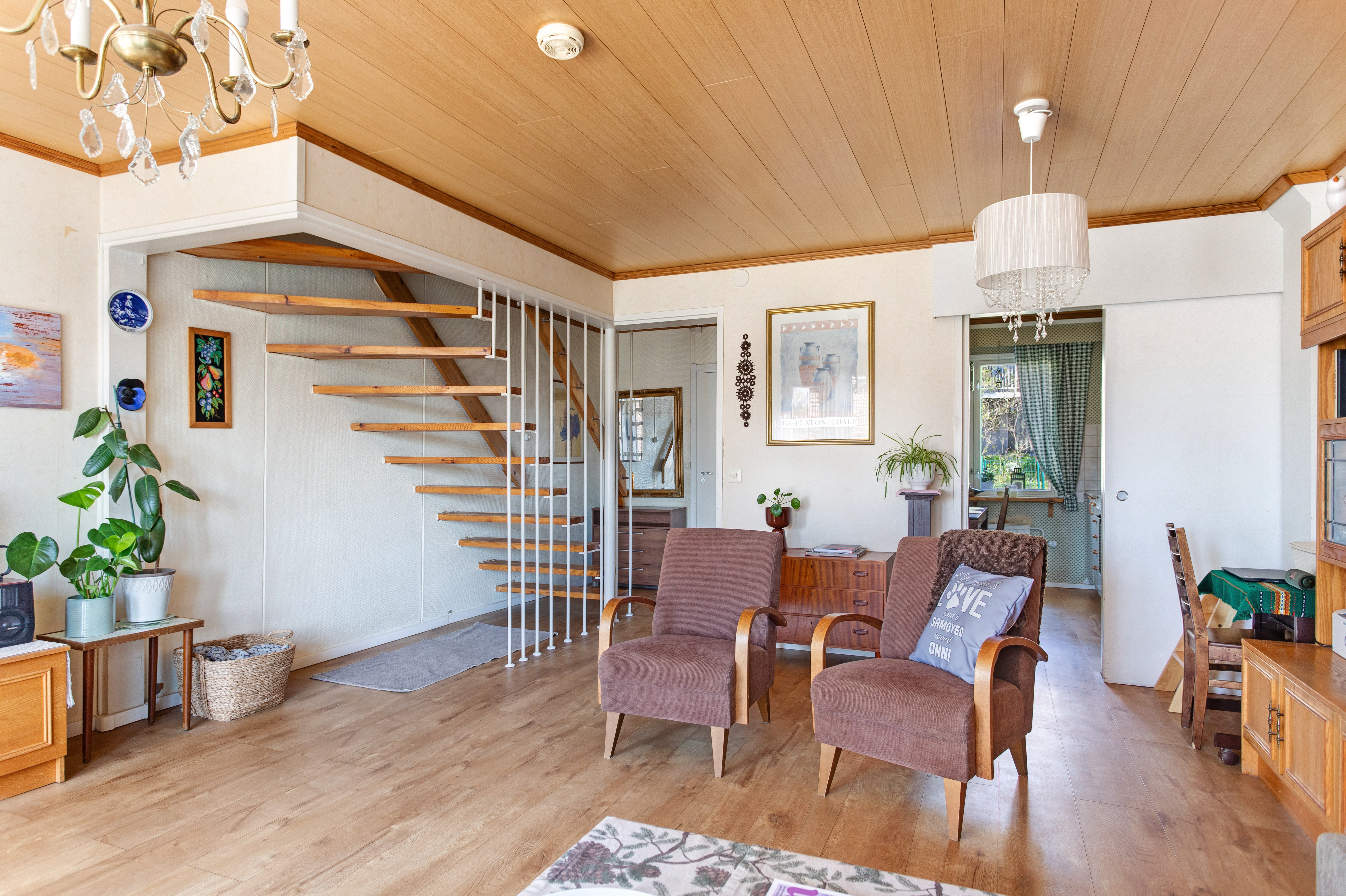 Asunnon tilat jakautuvat kahteen kerrokseen. Sisääntulokerroksessa on kodikas keittiö, jonka ikkunoista avautuvat näkymät piha-alueelle. Keittiöön mahtuu hyvin myös ruokailuryhmä. Tilava olohuone suorastaan kylpee auringonvalossa ja sieltä on käynti avonaiselle terassiparvekkeelle, josta avautuvat kauniit ja kauaskantoiset näkymät. Tässä kerroksessa on kauniit vinyylilankkulattiat.