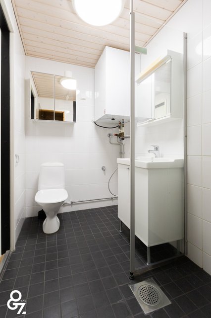 - Varustus: Suihku, suihkuseinä, pesukoneliitäntä, 2x peilikaappi, allaskaappi, WC-istuin ja bidee-suihku. Lattia: laatta Seinät: klinkkeri Katto: paneeli