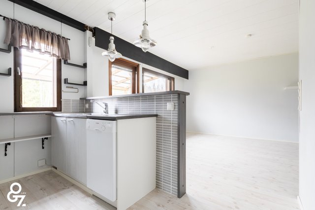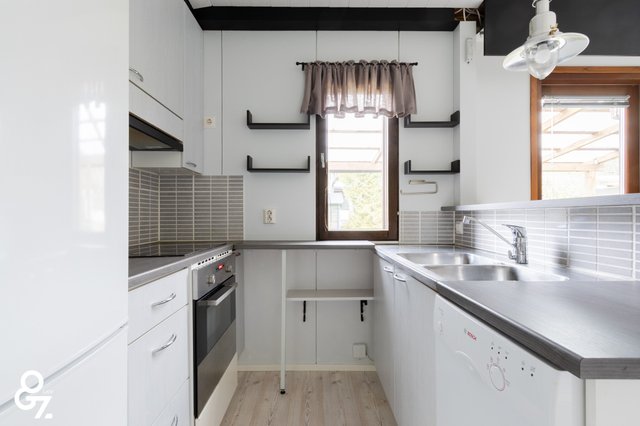 - Varustus: Keraaminen liesi, astianpesukone, jääkaappipakastin, tasotilaa ja kaapistot. Lattia: laminaatti (2011 laitettu lattiaan) Seinät: maalattu levy (poistettu seinää olohuoneen ja keittiön osalta (2013). Katto: maalattu levy