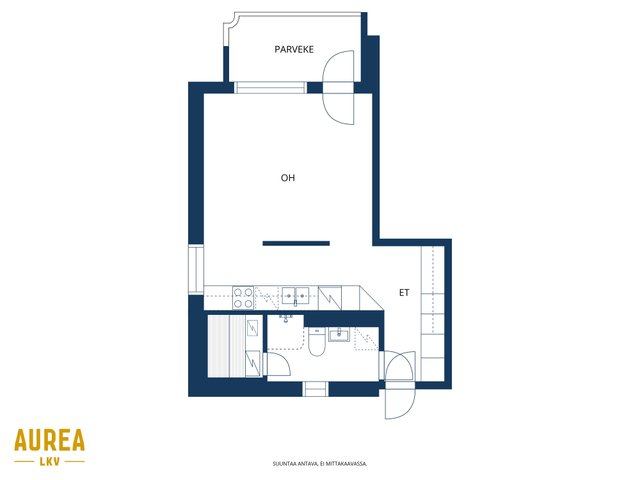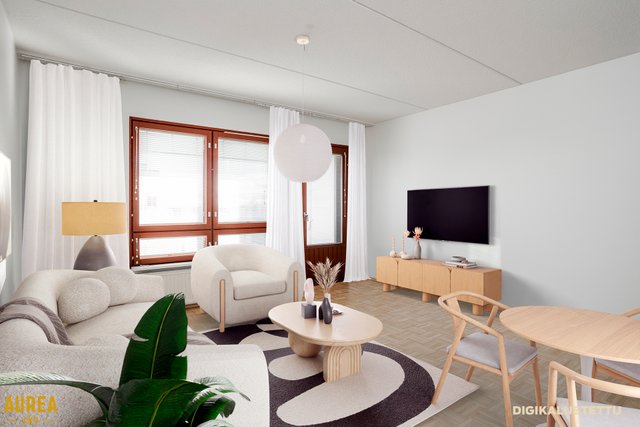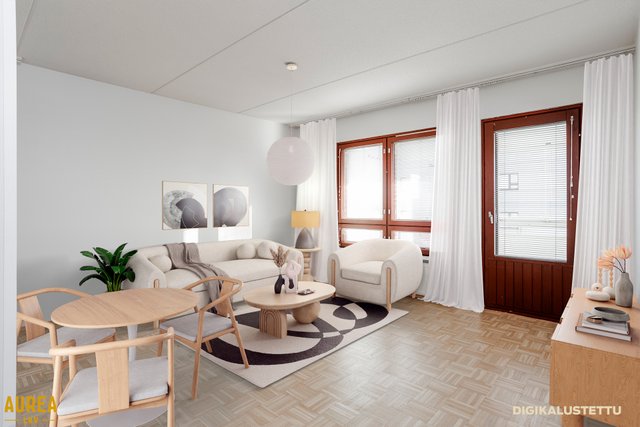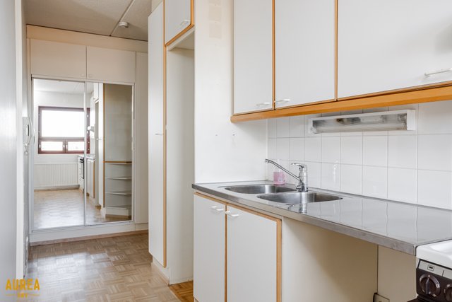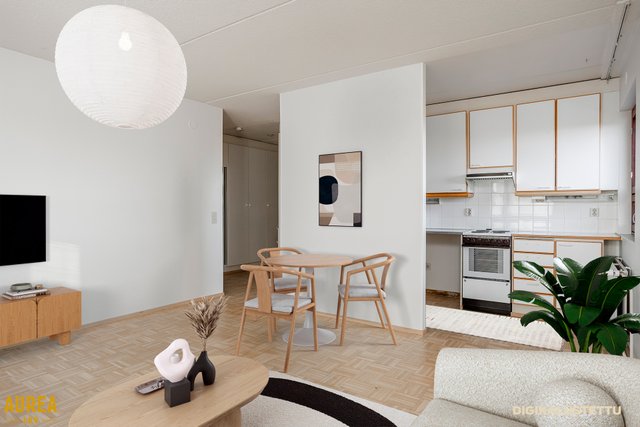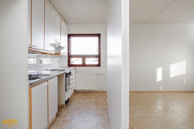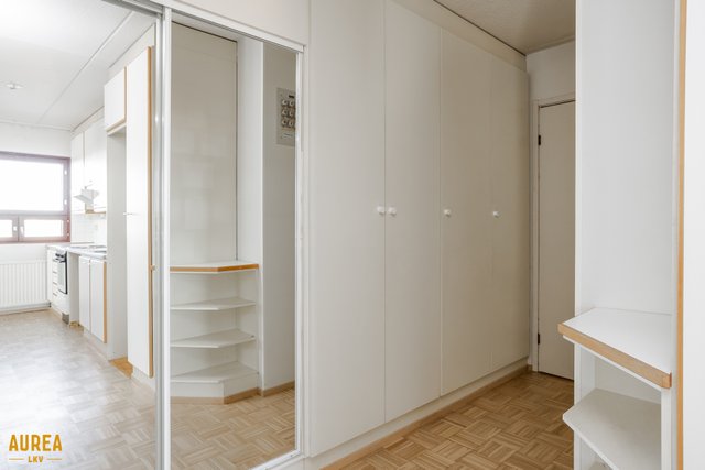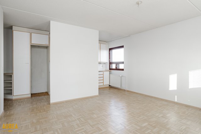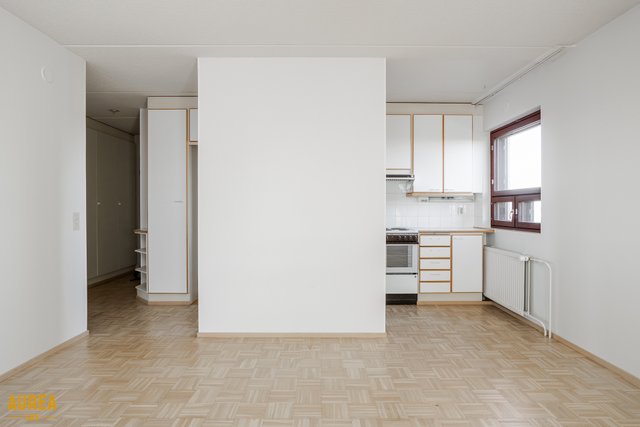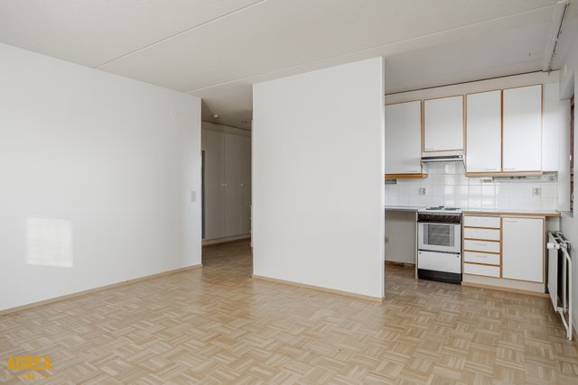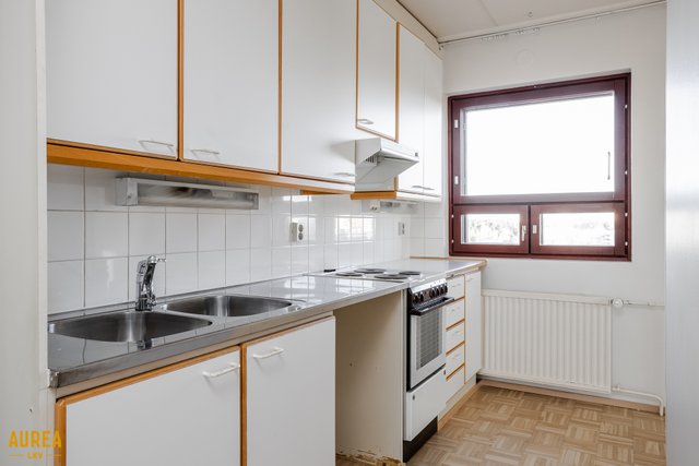 - Peruskuntoinen asunto, mosaiikkiparketti hiottu ja lakattu, lattialistat uusittu ja seiniä maalattu.