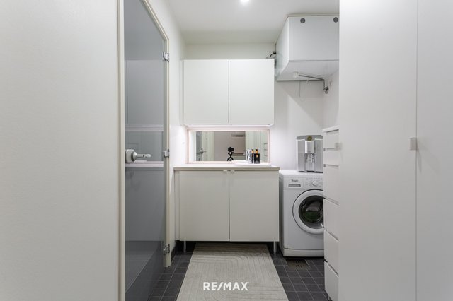 - Pyykkikaapit, lattiakaivo, pesuallas, lattialämmitys, pesukoneliitäntä, pöytätaso, tila pesutornille, ja kaapistot