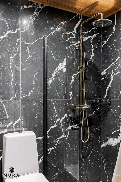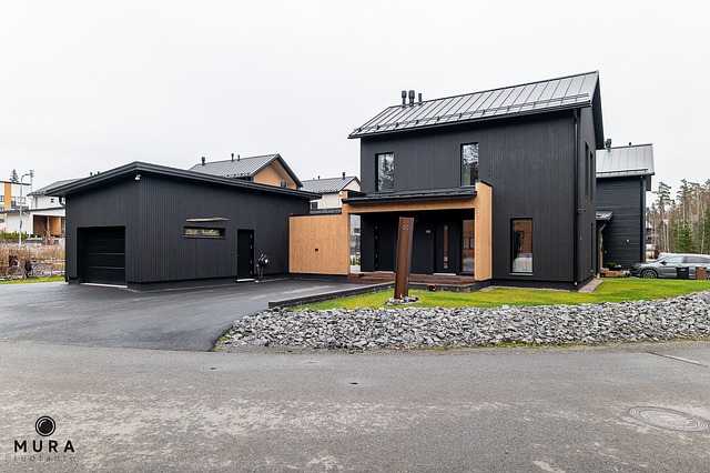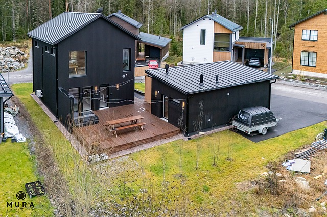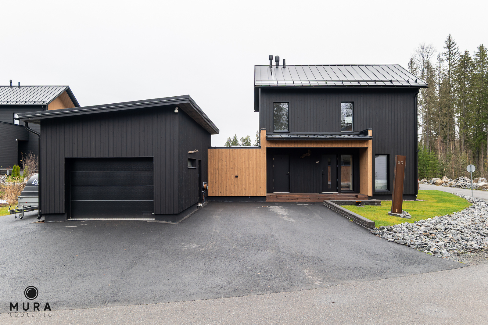 Ulkotilat ovat oma lukunsa. Atrium-tyylinen sisäpiha on suojaisa ja viimeistelty kokonaisuus: tunnelmallinen ulkosauna puukiukaalla, upeat pesutilat, sekä isot terassialueet porealtaineen. Harvinaista on myös lämmin autotalli sähköauton latausmahdollisuudella. Kuten kaikki muukin tässä kodissa, myös etupiha on viimeistelty loppuun asti – se on päällystetty siististi asfaltilla.