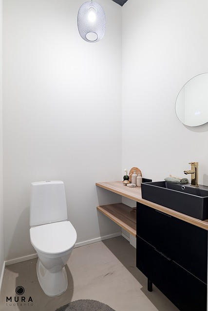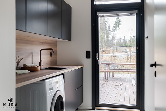 - Pesuallas, pesukoneliitäntä, lattiakaivo, pöytätaso, ja pyykkikaapit