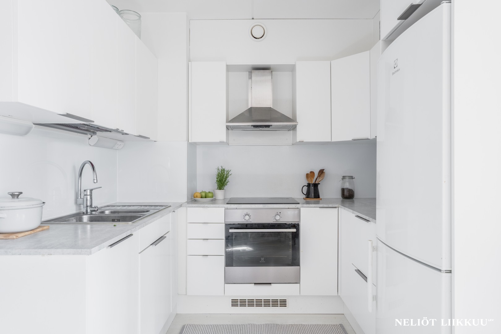 - Vasta "sisäänajettu" keittiö (2022-23), jossa hyvin kaappi- ja laskutilaa, jääkaappipakastin, astianpesukone, induktiotaso, kalusteuuni, liesisuodatin. paikka mikrolle, välitilassa sisustuslevy, laminaattitasot, seinät maalattu, laminaattilattia (2023).