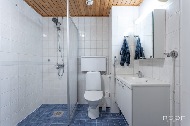 - Varustua: suihku, suihkuseinä, wc-istuin, bidee-suihku, pesukoneliitäntä, peilikaappi, allaskaappi. Koko tila on laatoitettu.