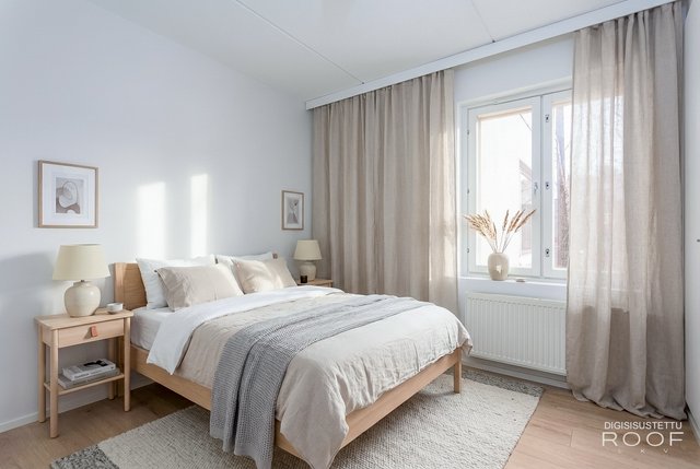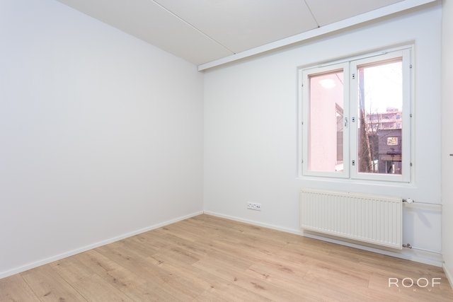 - Makuuhuoneessa on koko seinän levyiset vaatekaapit. Lattia laminaattia ja seinät maalattu.