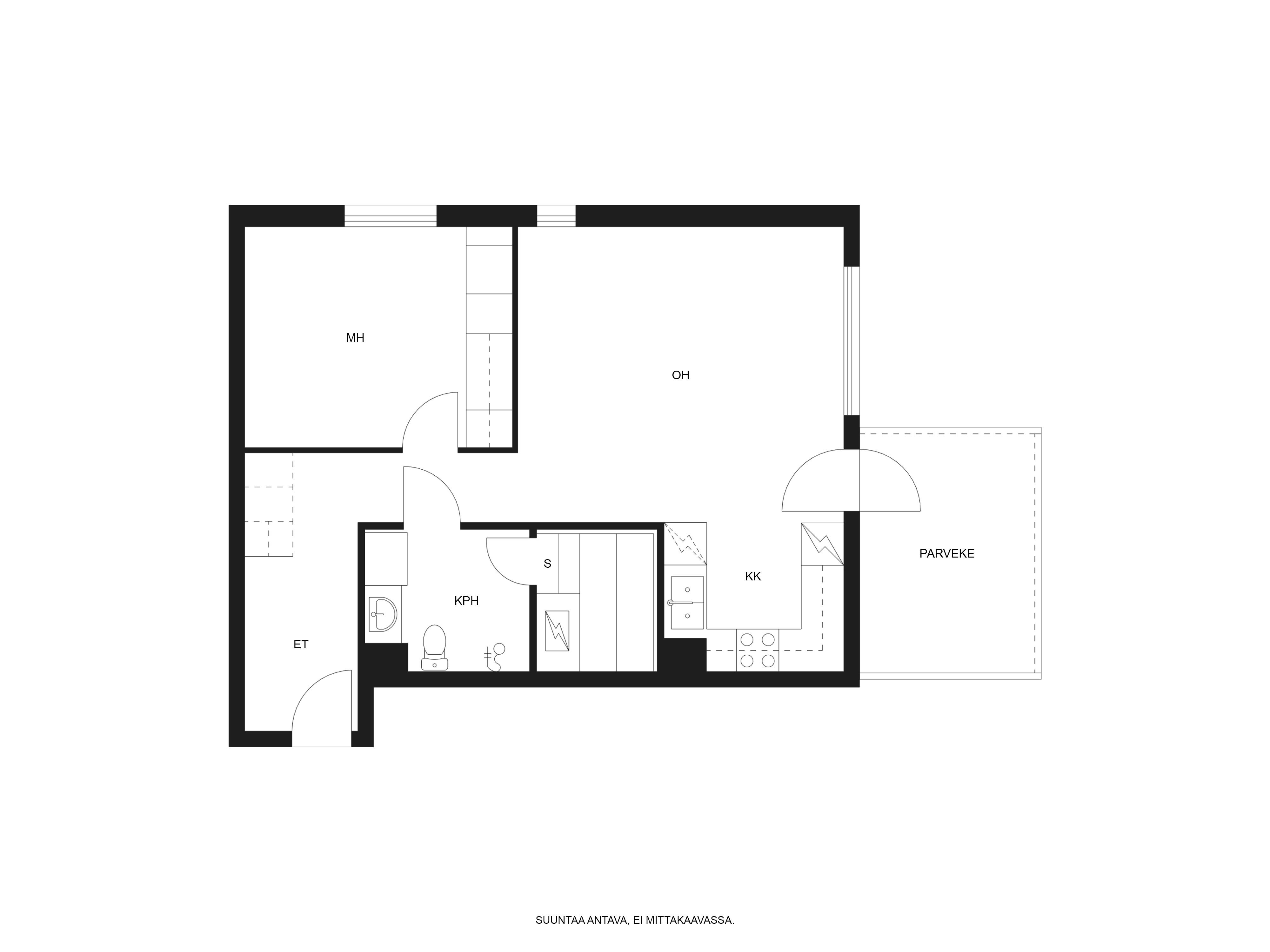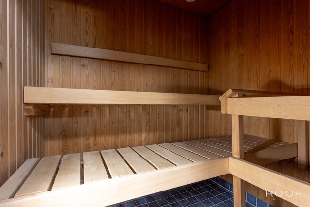 Olohuoneessa on tilaa myös ruokailulle, ja sieltä on käynti lasitetulle parvekkeelle, joka avautuu etelään puistonäkymillä. Makuuhuoneessa on runsaasti säilytystilaa koko seinän levyisillä vaatekaapeilla. Kylpyhuone on tilava ja sen yhteydessä on oma sauna.