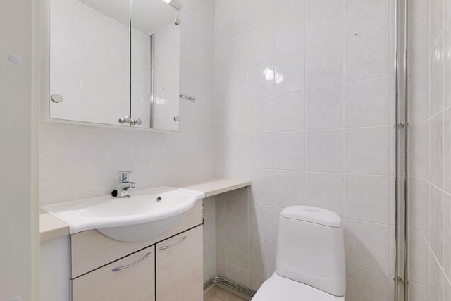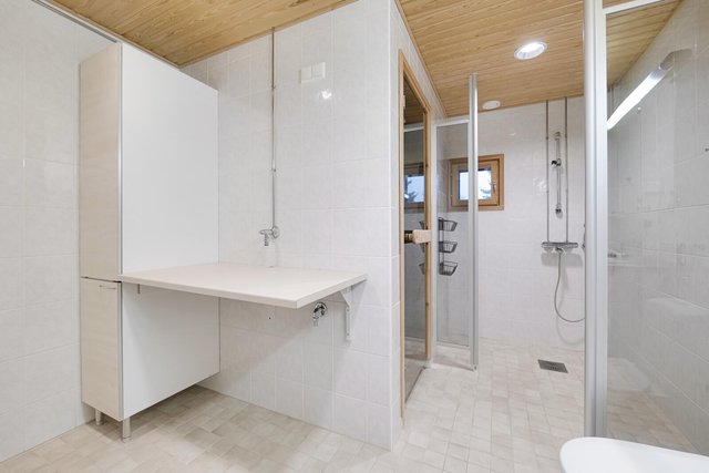 - WC-istuin, suihku, suihkuseinä, pesukoneliitäntä, lattialämmitys, peilikaappi, pesuallas, allaskaappi, ja bidee-suihku
