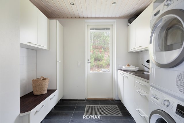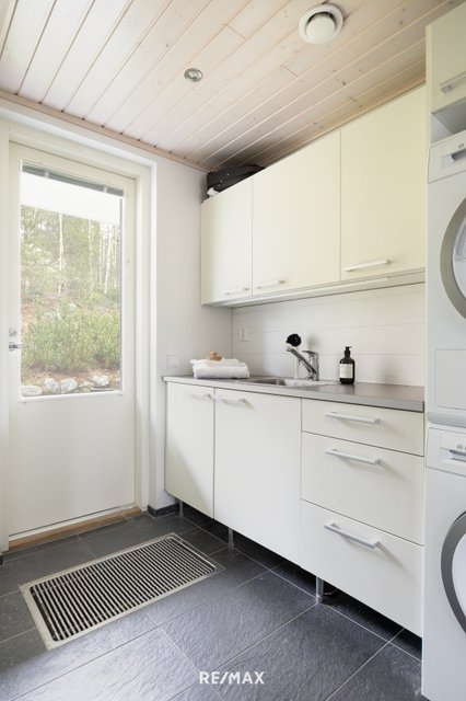 - Pesukoneliitäntä, lattiakaivo, kurapiste, tila pesutornille, lattialämmitys, pesuallas, ja pyykkikaapit
