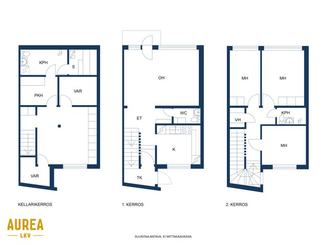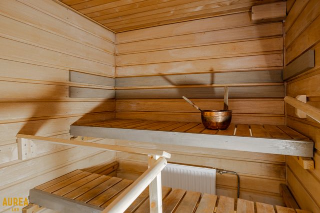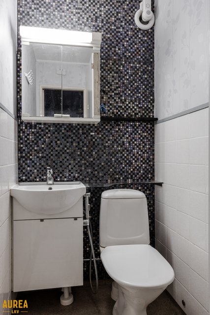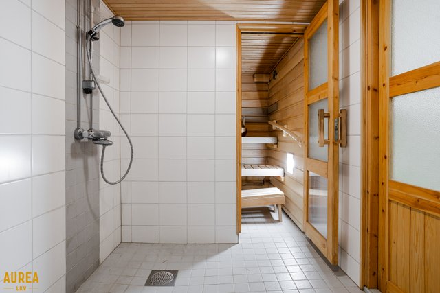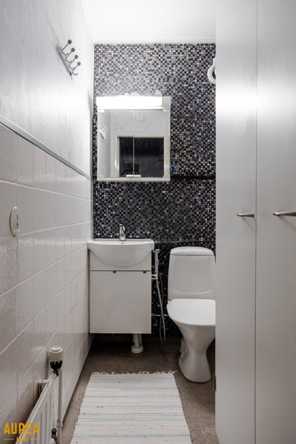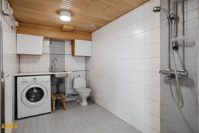 - Kellarissa pukuhuone, kylpyhuone ja sauna. Liitännät pyykinpesukoneelle ja wc-istuin. Yläkerrassa kylpyhuone jossa suihku, pesuallas, peilikaappi sekä wc-istuin. Alakerrassa erillinen wc jossa allaskaappi, peilikaappi sekä wc-istuin.