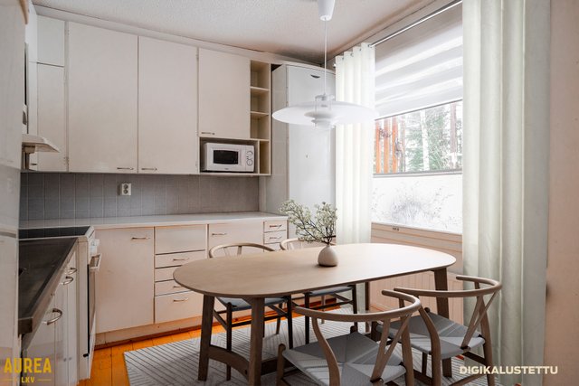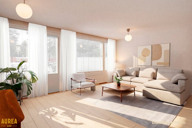Kaukovainion Helatiellä sijaitseva tilava, kolmen makuuhuoneen rivitalokoti odottaa uusia asukkaitaan. Kaukolämpöön liitetty koti tarjoaa 60-luvulle tyypillistä avaruutta, selkeitä linjoja sekä suuret ikkunapinnat, jotka tulvivat luonnonvaloa sisään ja tekevät huonetiloista valoisat.