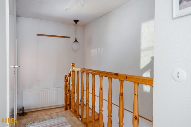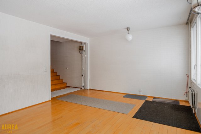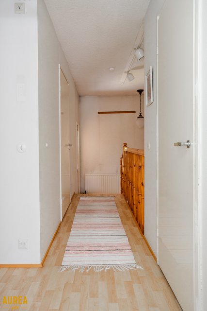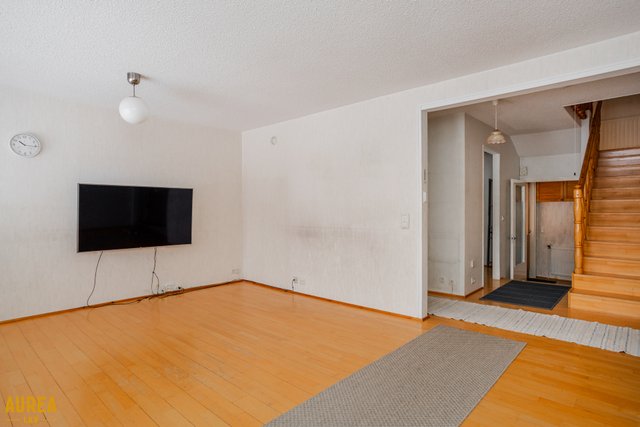 Asunnon tilat jakautuvat kolmeen kerrokseen, joista kaksi ylintä muodostavat varsinaiset asuintilat. Sisääntulokerroksessa avautuu tilava olohuone, jossa suuret ikkunat ja avara pohjaratkaisu. Keittiö on alkuperäinen mutta toimiva – erinomainen lähtökohta oman näköiselle päivitykselle. Olohuoneesta on käynti takapihalle ja terassille, jossa suojaisa etelä–länsisuuntainen piha tarjoaa aurinkoa ja viihtyisiä hetkiä pitkälle iltaan. Yläkerrassa sijaitsevat kolme makuuhuonetta, wc-kylpyhuonetila sekä käytännöllinen vaatehuone.