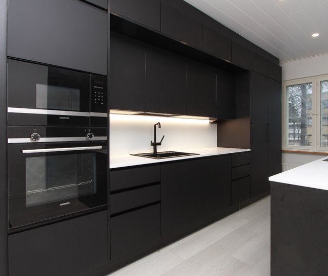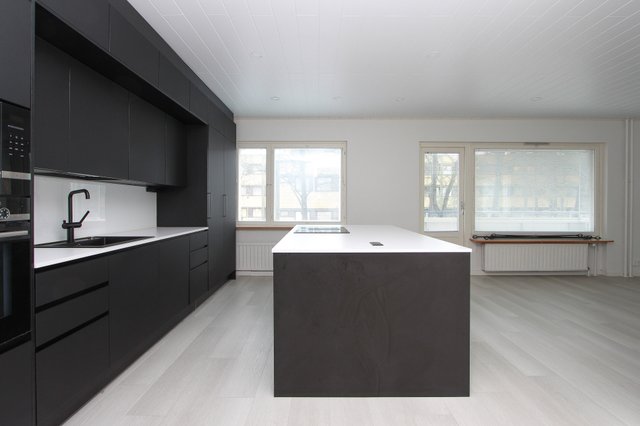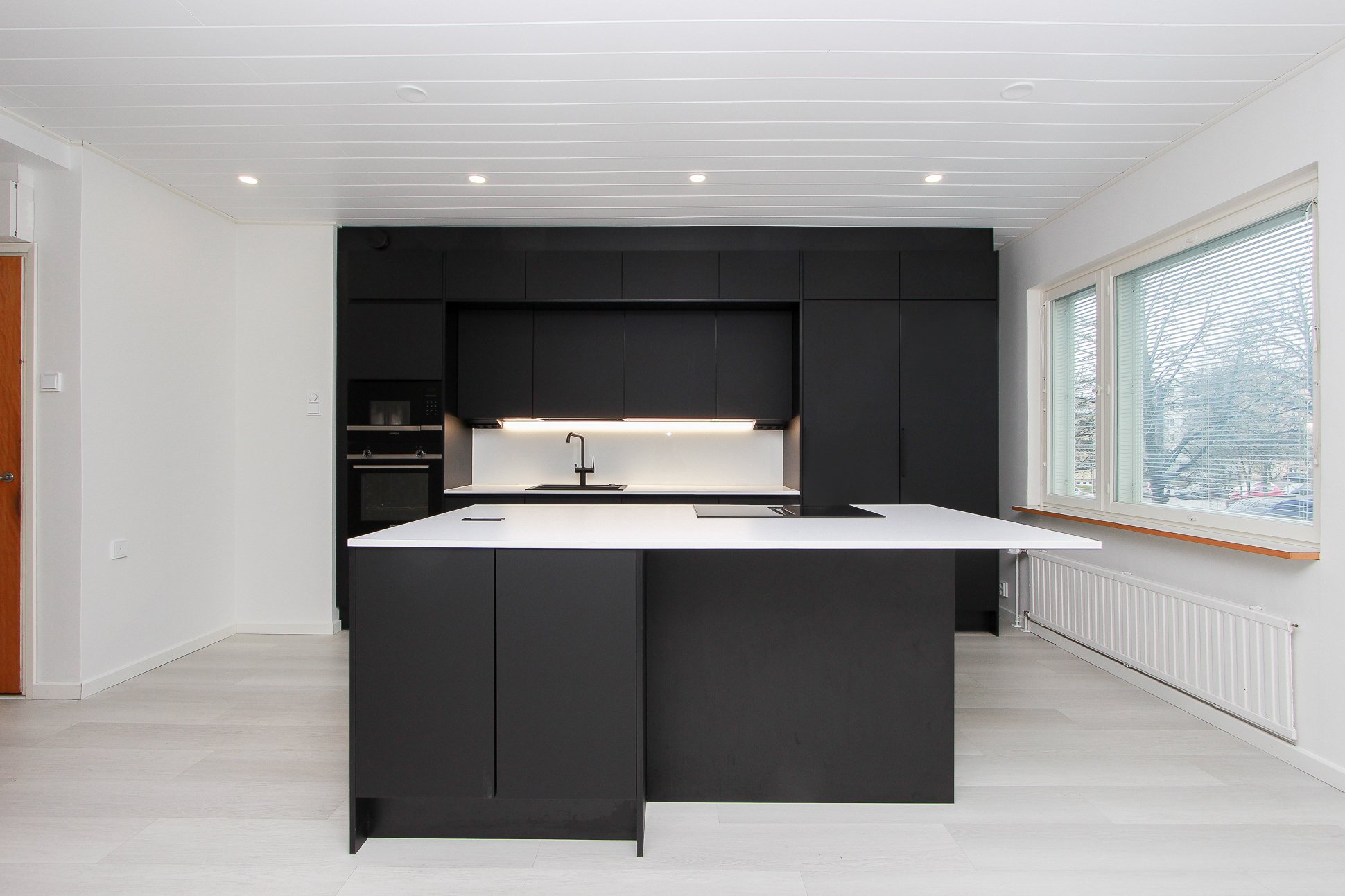 - Puustellin kaapistot, integroitu mikroaaltouuni, jääkaappi, pakastinkaappi ja astianpesukone, induktioliesi, liesituuletin, kiertoilmauuni, komposiittiallas ja saareke. Keittiö remontoitu v. 2021.