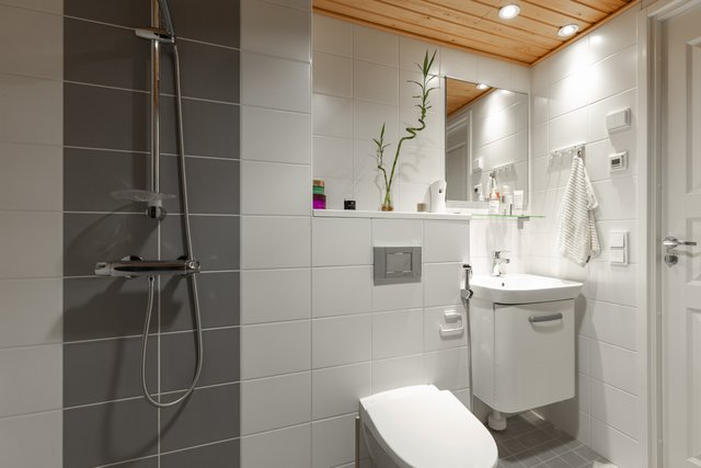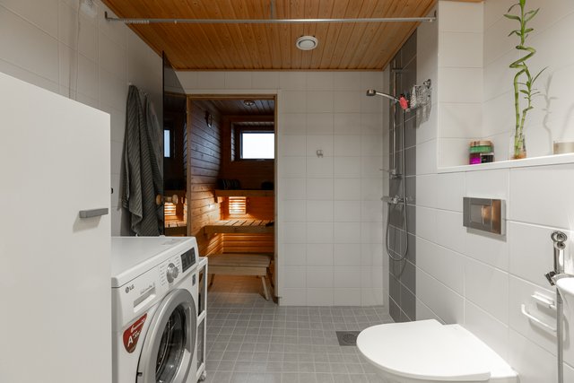 - WC-istuin, suihku, pesukoneliitäntä, lattialämmitys, peili, allaskaappi, pesuallas, ja bidee-suihku